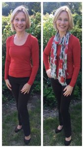 Accessories can be the “glue” that unites individual pieces to make an outfit. Here this is achieved with a patterned scarf containing similar colours to the top and trousers. The pattern also adds interest to an otherwise plain outfit.